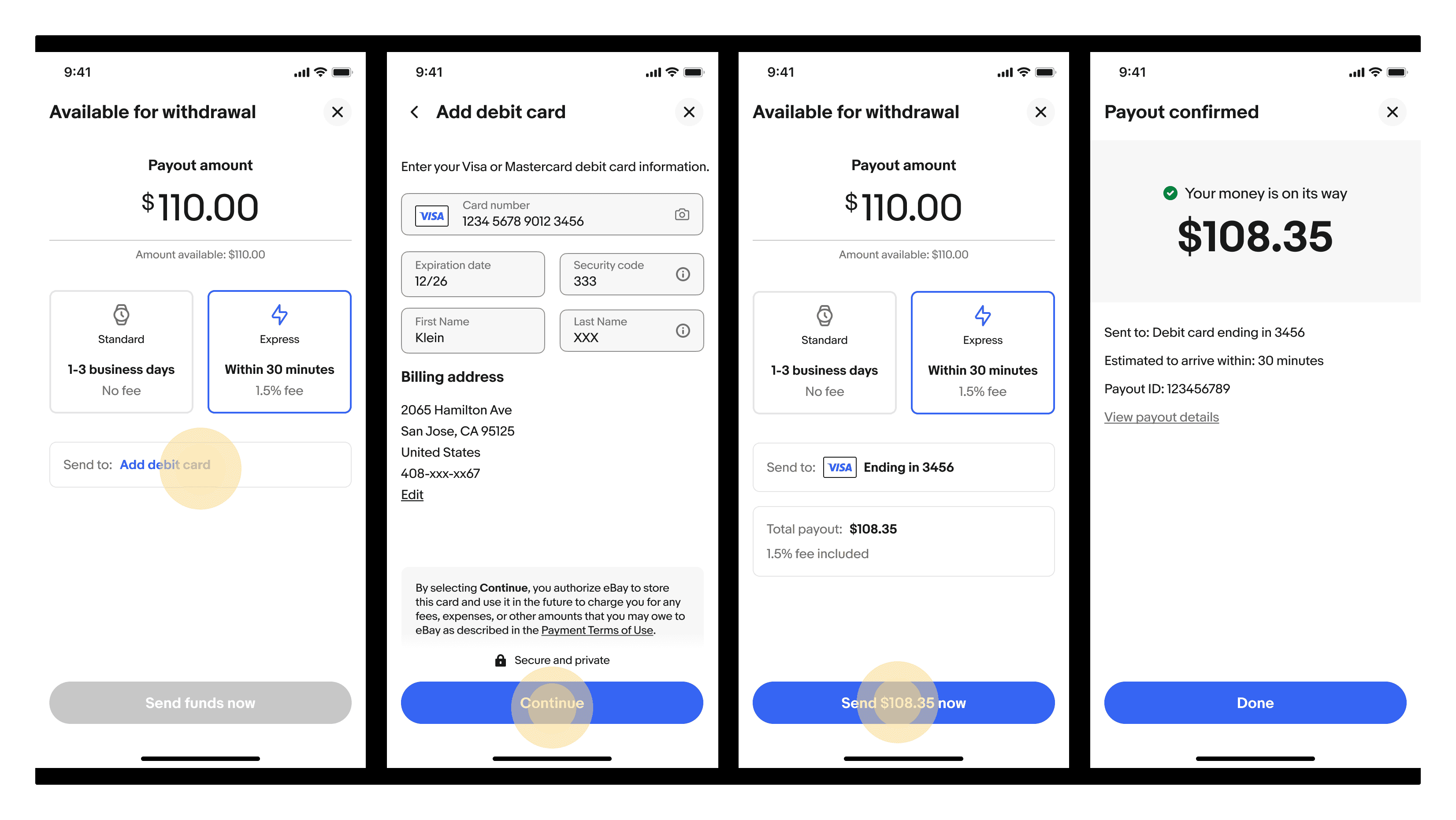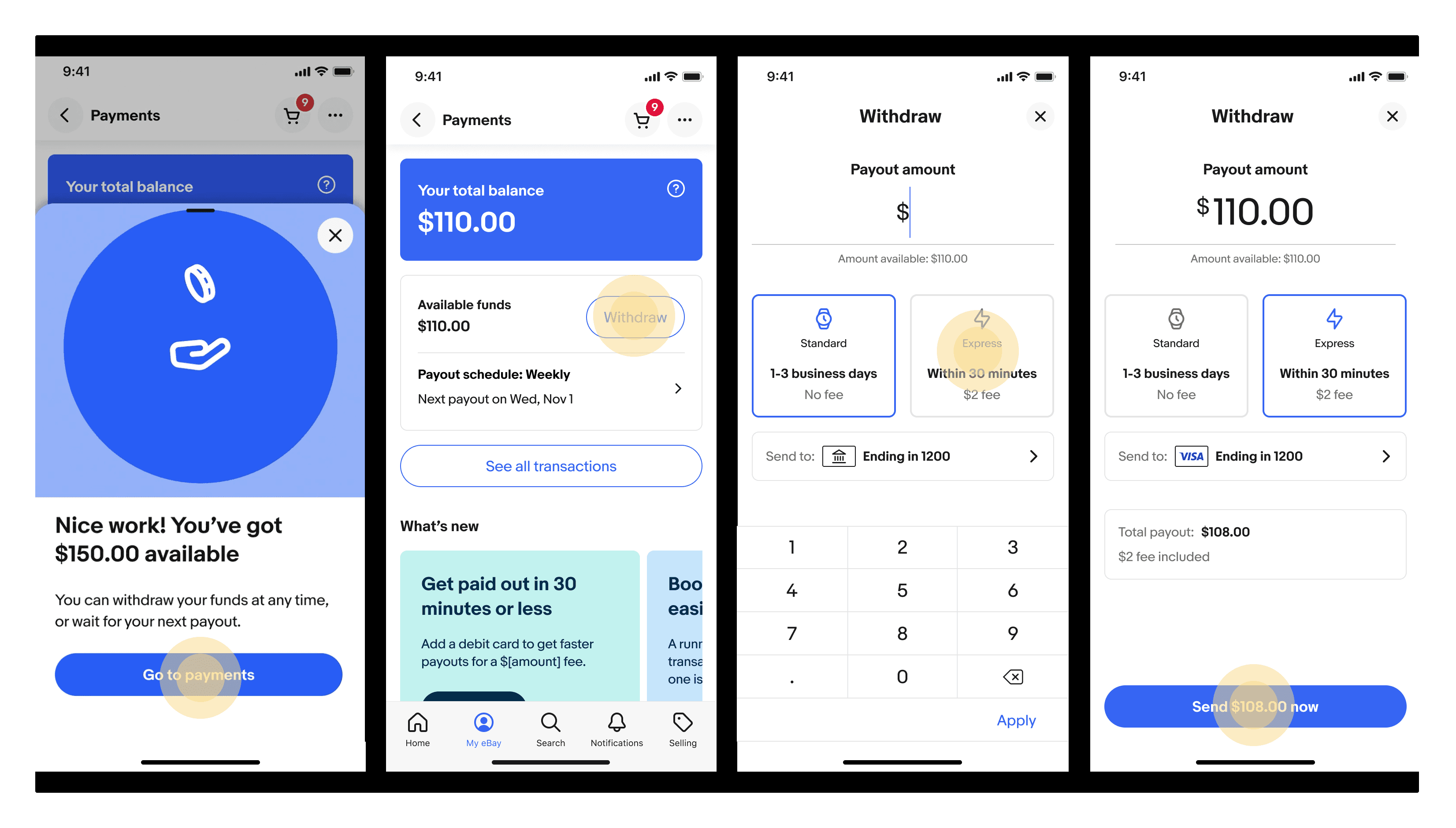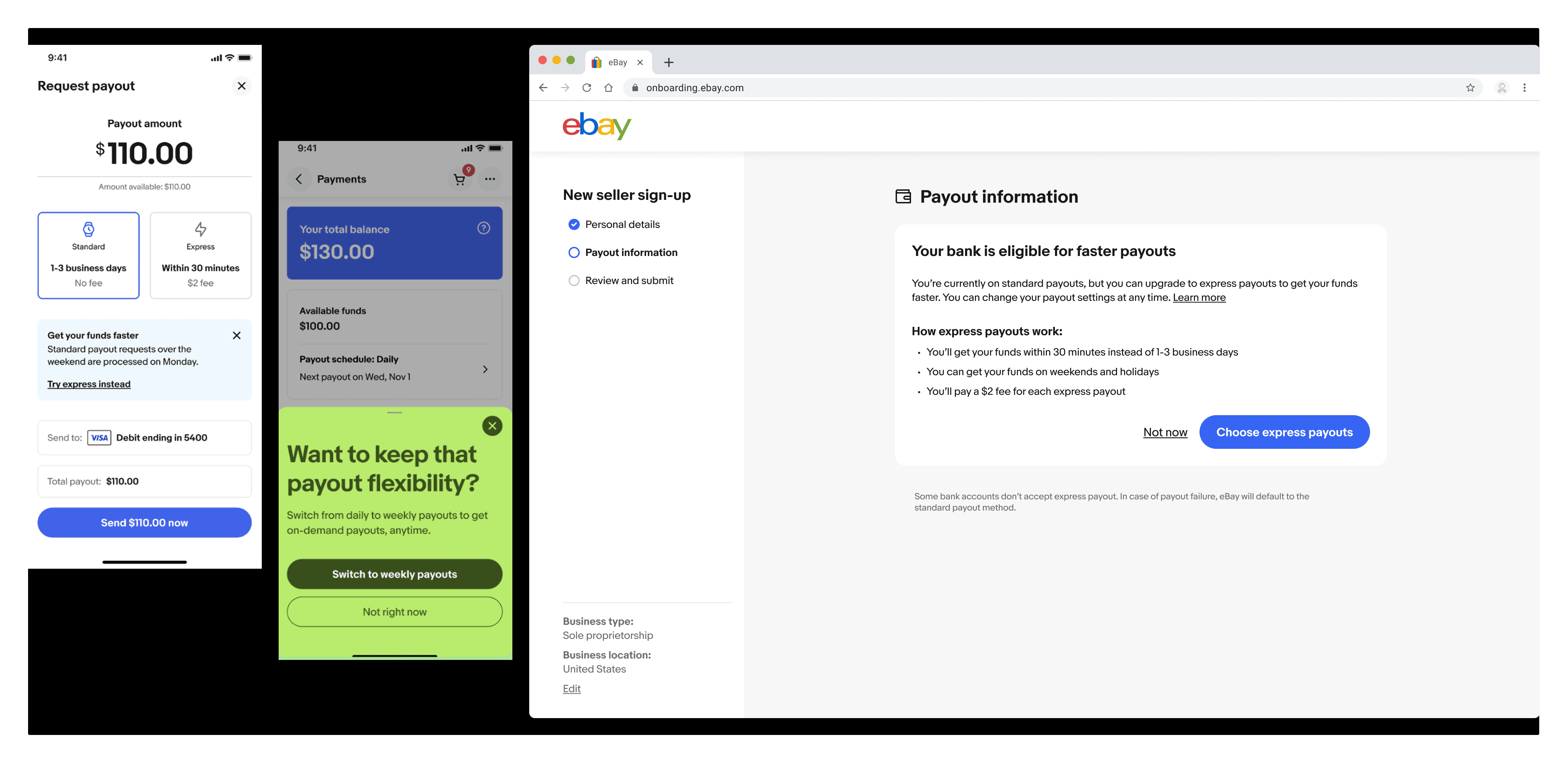 eBay: Express Payouts Launched in beta in early 2022, Express Payouts allowed eBay sellers to bypass 1–3 day bank transfers for a 1.5% fee via debit card to access their earnings in under 30 minutes. Despite the faster speed, adoption was low. I joined mid-year to address significant funnel drop-off and low revenue. To scale and improve the program, I led an overhaul of the product, including it's primary entry point -- On-Demand Payouts -- in addition to other updates.